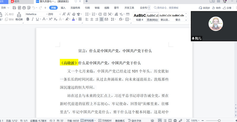 在党的101岁生日之际,为重温党的光辉历史,继承、发扬党的光荣传统和优良作风,进一步增强支部的凝聚力、战斗力,激励广大党员坚定理想信念,7月1日,保障和直属部门第九支部以腾讯会议形式开展朗诵“宣言”学党章主题党日活动。