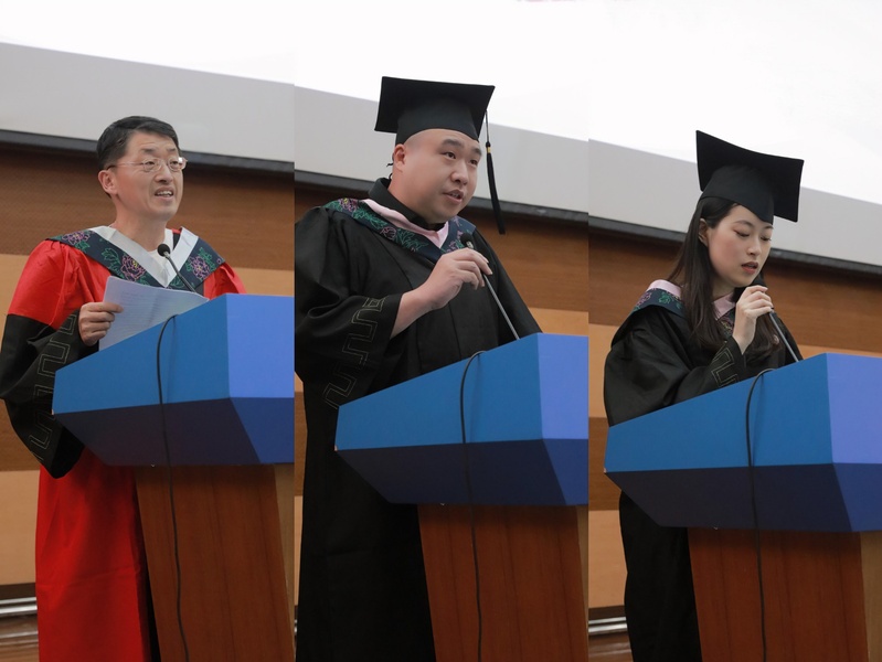 教师代表、信息学院郑奕教授向毕业生圆满完成学业表示热烈祝贺,并勉励毕业生“坚持了就会有希望,承担了才能成长,争取了才有机会,挑战了才能突破。”要相信自己、相信未来,坚定信念、勇往直前,克服困难,实现梦想。