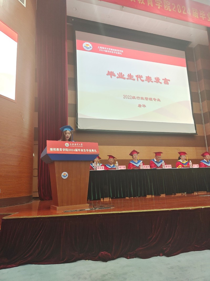 优秀员工代表、行政管理专业唐华同学代表全体毕业生发言。在半工半读生涯中,自己的耐力在一点点沉淀,思考在一点点精进,认知在一步步提高。她表达了对母校、老师感激之情,表示将践行校训,把自己的小我融入祖国的大我,成为堪当民族复兴重任的时代新人!